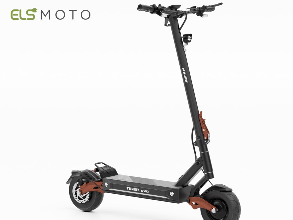 Nová skládací elektrokoloběžka Hiley Tiger EVO PRO, motor výkon 2x1000W (max 3000W), baterie 52V/22,5 Ah (1170Wh), dojezd až 70 km. Maximální rychlost 65 km/hod., "C" odpružení v předu i vzadu, LED světlo, NFC, IPX6, celohliníkové tělo.