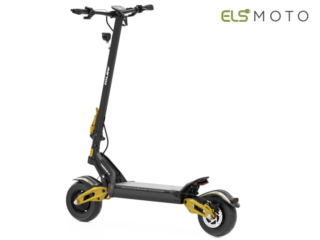Nová skládací elektrokoloběžka Hiley Tiger T10 V5, motor výkon 2x1000W (max 4000W), baterie 52V/27 Ah (1404Wh), dojezd až 80 km. Maximální rychlost 65 km/hod., "C" odpružení v předu i vzadu, LED světlo, NFC, IPX6, celohliníkové tělo.